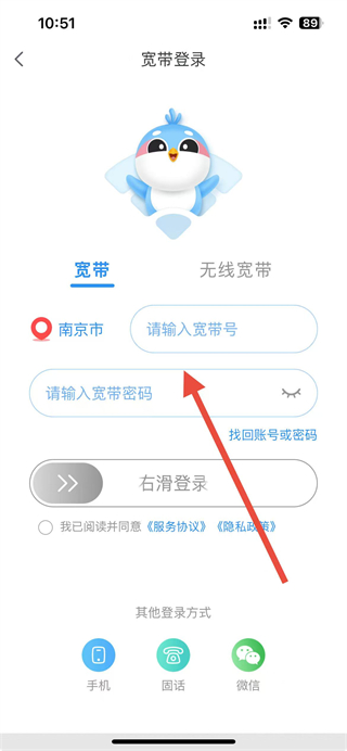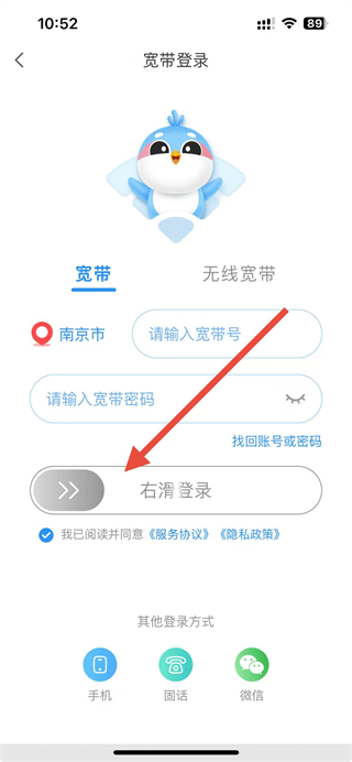 4、勾选已阅读并同意相关协议后,右滑登录按钮即可完成宽带账号登录。