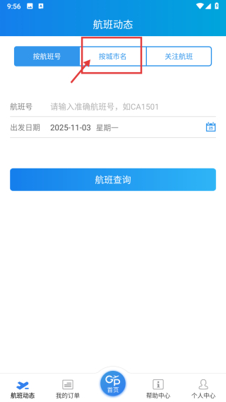 2、在航班动态查询页面,点击按城市名查询方式选项,进入城市名航班查询设置页面。