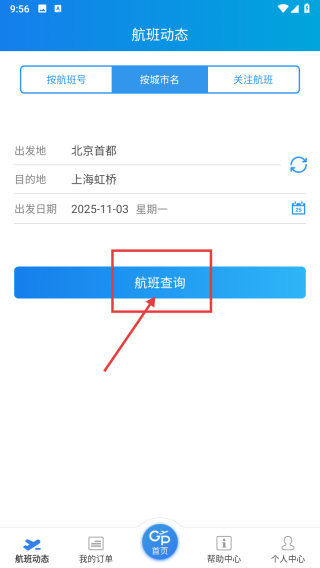 3、在城市名航班查询设置页面,设置出发地、目的地及出发日期后,点击航班查询按钮,进入航班信息列表页面。