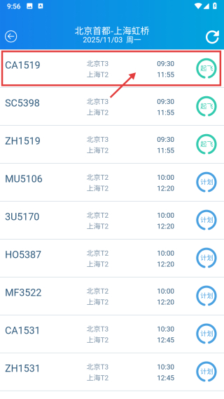 4、在航班信息列表页面,即可查看对应航班信息如CA1519等航班的起降时间、状态等。