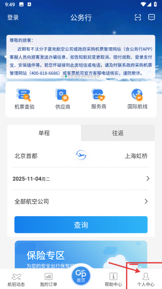 1、打开公务出行类APP,点击底部个人中心选项,进入个人中心页面。