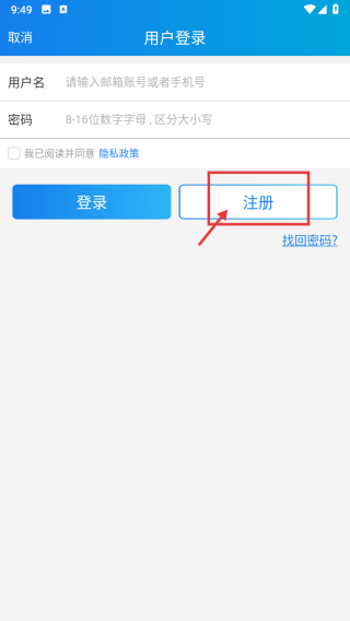 3、在用户登录页面,点击注册选项,进入用户注册信息填写页面。