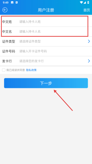 4、在用户注册信息填写页面,填写中文姓、中文名、选择证件类型勾选同意协议后点击“下一步”按钮,完成账号注册操作。