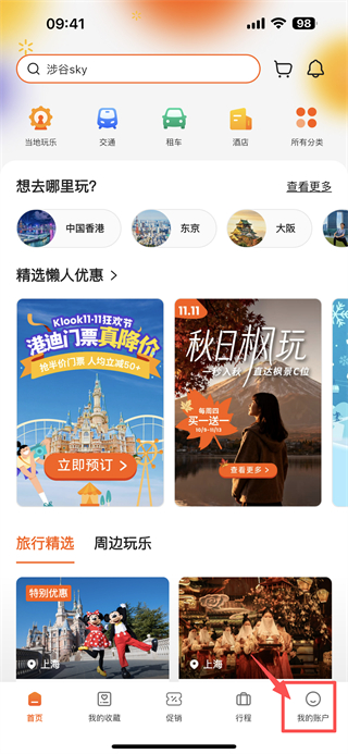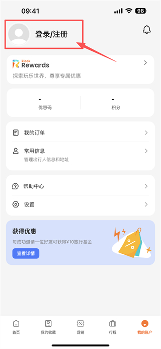 1、打开旅行服务类APP首页,点击底部我的账户选项,进入个人中心页面。
