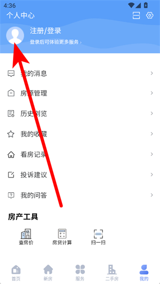 2、在个人中心页面,点击注册登录头像区域,进入登录页面。