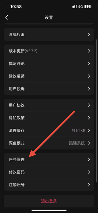 3、进入设置页面后,点击账号管理选项,进入账号管理页面。