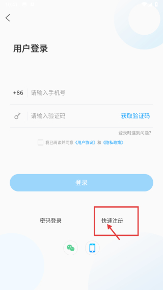 3、在用户登录页面,点击快速注册选项,进入用户注册页面。