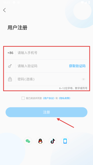 4、在用户注册页面,填写手机号,获取并输入验证码,点击注册按钮,完成账号注册操作。