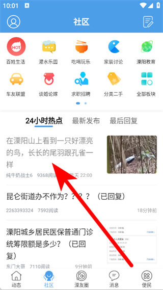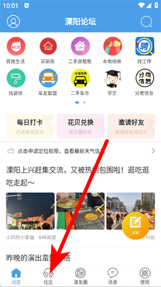 1、打开溧阳论坛,点击底部导航栏社区,进入页面。