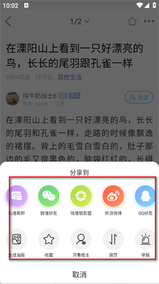 4、在弹出的分享选项中,选择微信好友、朋友圈等渠道,完成帖子分享。