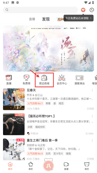 1、打开音频娱乐类APP首页,点击周边商城选项,进入猫耳商城页面。