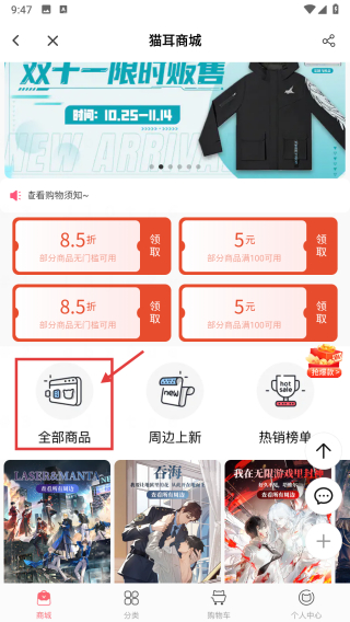 2、在猫耳商城页面,点击全部商品选项,进入商品列表页面。
