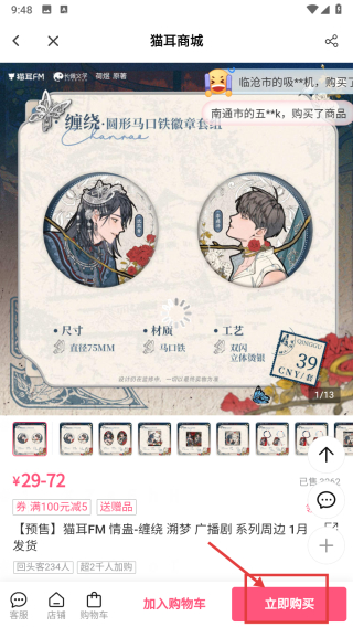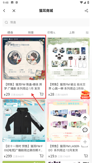 3、在商品列表页面,点击预售猫耳FM情蛊·缠绕消梦广播剧系列周边商品条目,进入商品详情页面。