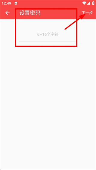 5、在密码设置页面,设置6~16个字符的密码后,点击下一步,进入用户名设置页面。