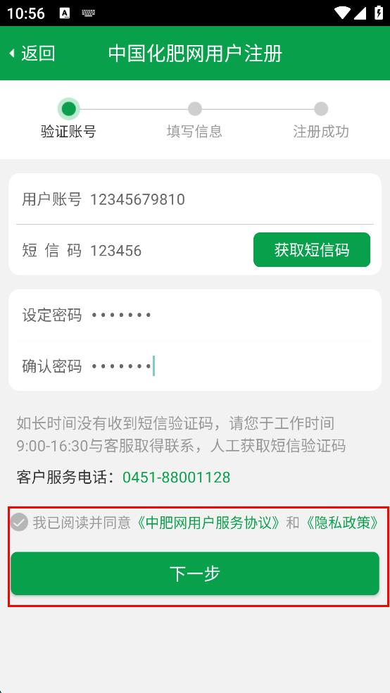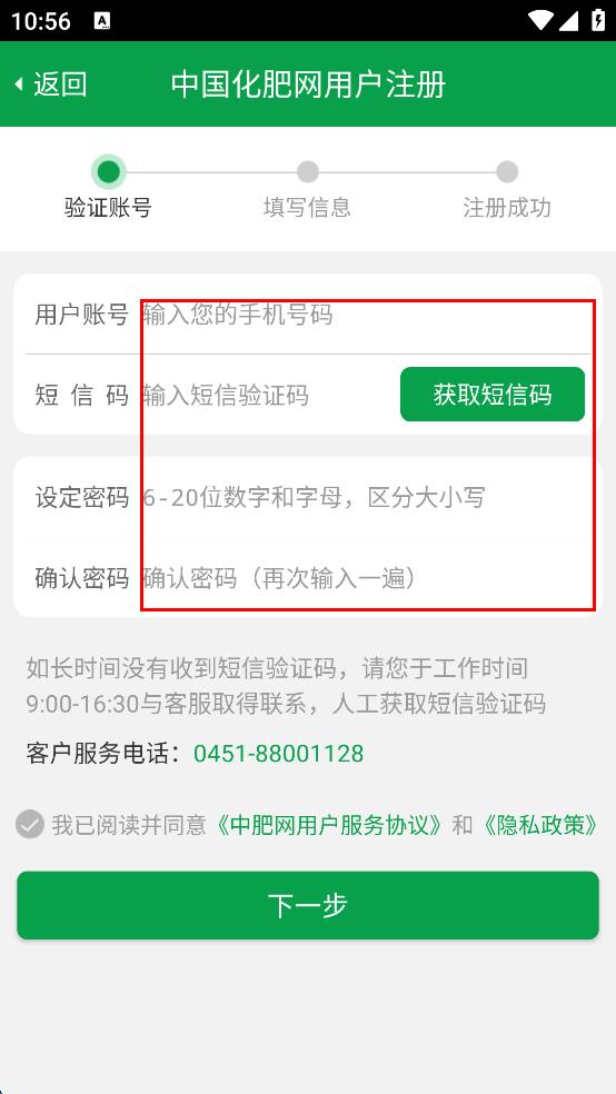 4、勾选我已阅读并同意中肥网用户服务协议和隐私政策,然后点击“下一步”按钮,进行后续注册流程。