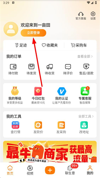 1.打开一亩田客户端,切换到“我要买”页面,点击“在线交易”。