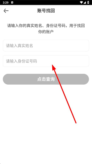 4、在账号找回页面,输入真实姓名和身份证号码,点击查询按钮,按照提示完成账号找回操作即可。