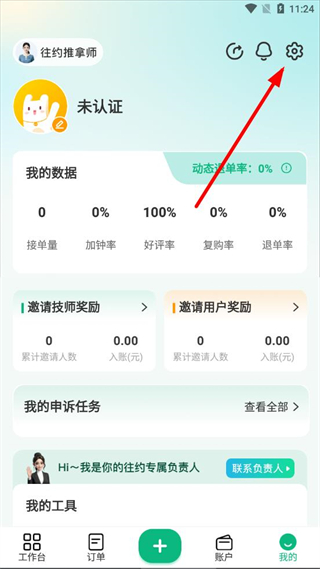 1、打开往约管理版APP,在我的页面点击右上角设置图标。