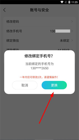 4、在弹出的提示框中,点击更换按钮,按照提示完成验证和绑定即可更改手机号。