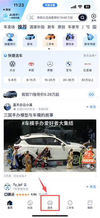 1、打开汽车资讯类APP首页,点击底部选车选项,进入选车页面。