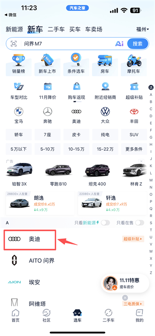 2、在选车页面,点击奥迪品牌,进入奥迪车型列表页面。