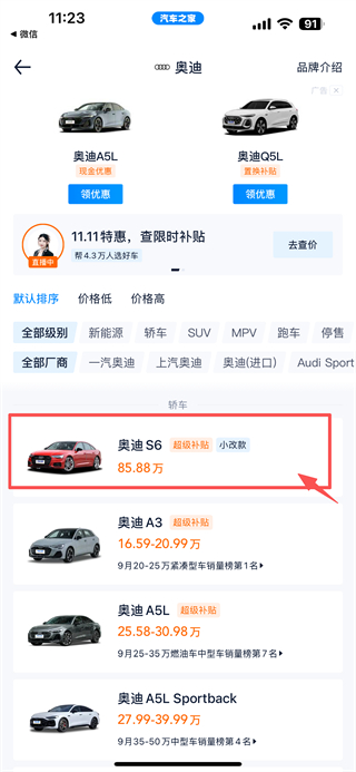 3、在奥迪车型列表页面,点击奥迪S6车型条目,进入车型详情页面。