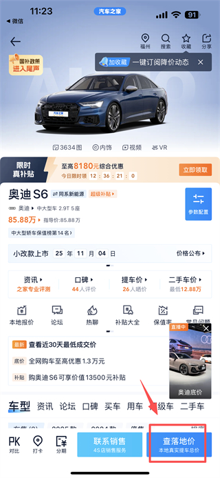 4、在车型详情页面,点击查落地价按钮,即可查询该车型的本地真实提车总价。