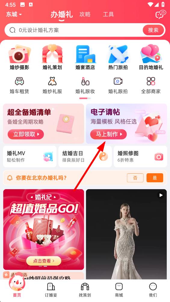 1、打开婚礼纪App进入首页点击电子请帖板块中的马上制作按钮,进入请帖制作选择页面。