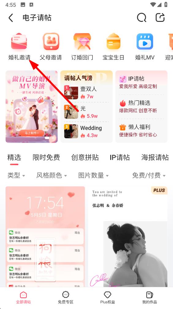 2、在请帖制作选择页面中点击婚礼邀请的选项卡,浏览各种婚礼邀请函模板。