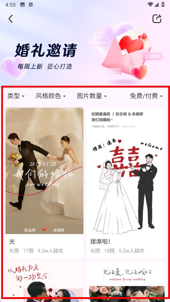3、根据喜好从展示的众多婚礼邀请函模板中挑选心仪的模板,可依据类型、风格颜色、图片数量、免费付费等条件筛选。