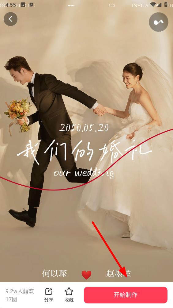 4、点击选中模板下方的开始制作按钮,进入编辑界面,按照提示上传照片、修改文字等信息,完成后即可生成专属婚礼邀请函。