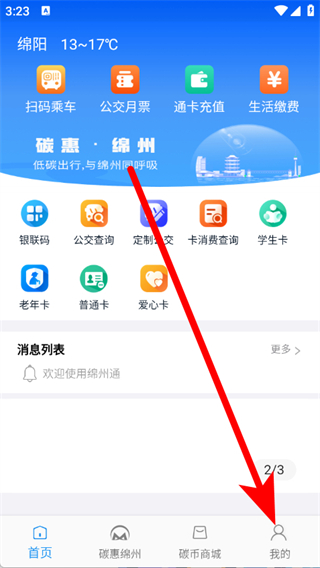 1、打开绵州通,点击底部导航栏我的,进入个人页面。