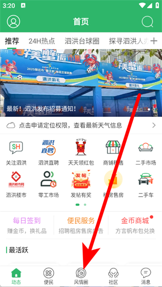 1、打开泗洪风情网,点击底部导航风情圈,进入页面。