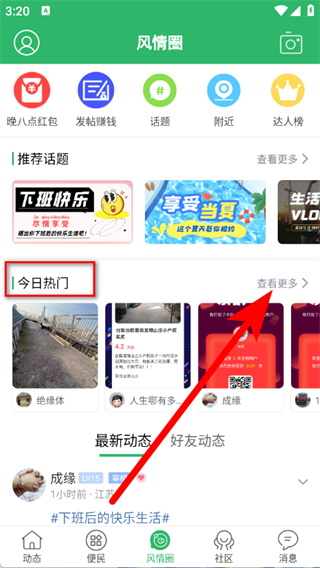 2、在风情圈页面,找到今日热门板块,点击查看更多。