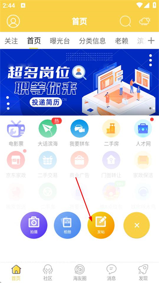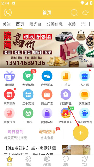 1、在滨海论坛首页,点击右下角黄色+按钮,弹出功能选项。