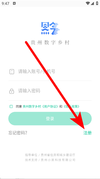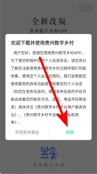 1、打开贵州数字乡村,在弹窗中点击同意,进入登录注册页面。