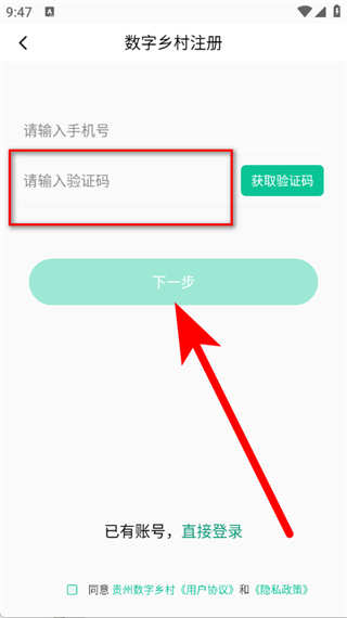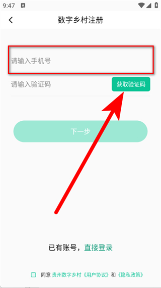 3、在数字乡村注册页面,输入手机号,点击获取验证码。