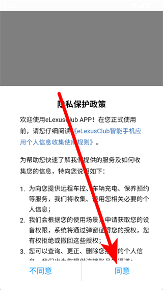 1、打开雷克萨斯,在隐私保护政策弹窗中,点击同意。