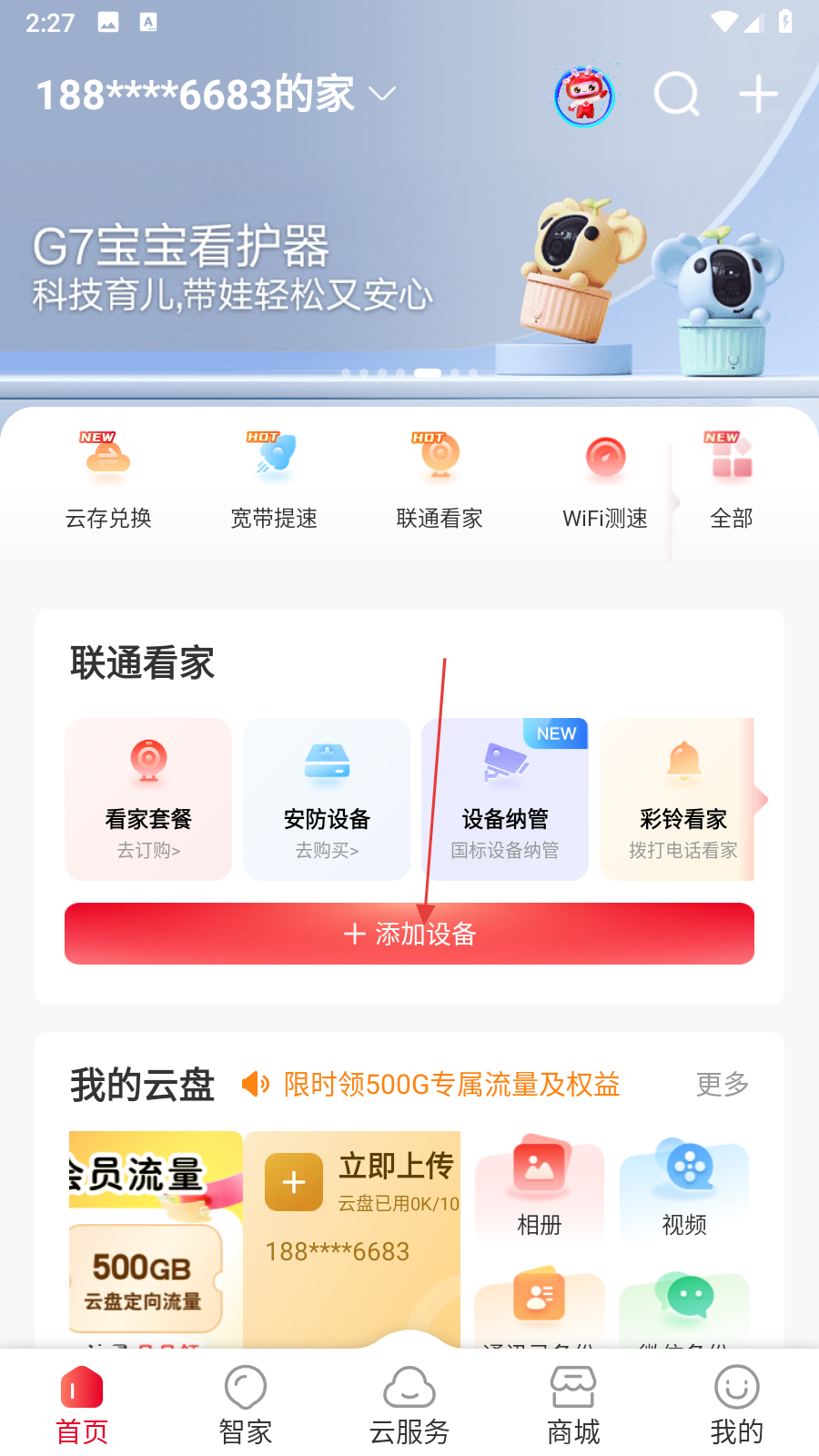 1、打开智慧沃家APP,进入首页后点击添加设备按钮,进入添加设备页面。