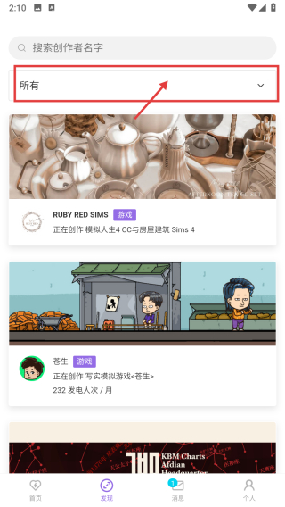 2、在发现页面,点击分类筛选框,展开分类列表。
