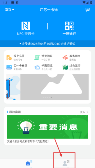 1、打开江苏一卡通APP,点击底部我选项,进入个人中心页面。