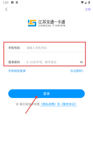 4、在登录界面,填写手机号码、登录密码并勾选协议后,点击登录按钮,完成账号登录。