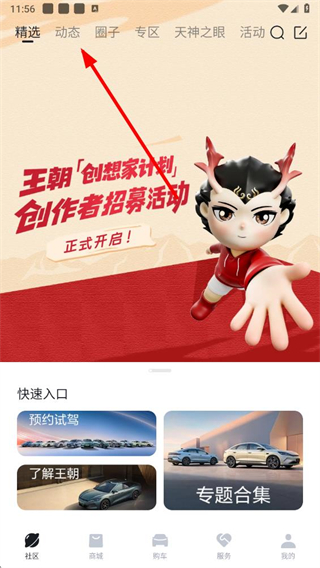 1、打开比亚迪app,在社区页面点击动态选项,进入动态页面。
