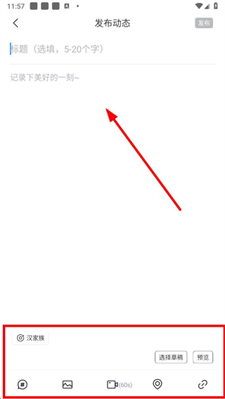 3、在发布动态页面,输入标题和动态内容,可添加话题、图片、视频、定位、链接等元素。