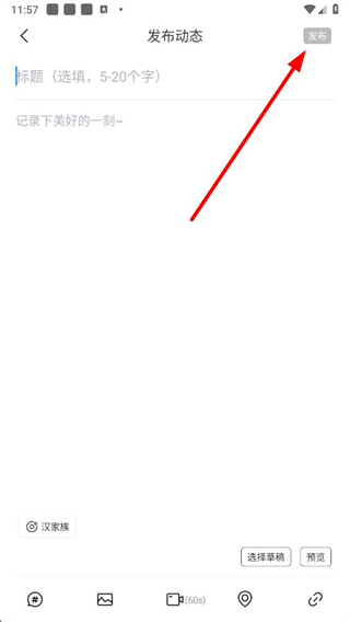 4、完成内容编辑后,点击右上角发布按钮,即可发布动态。