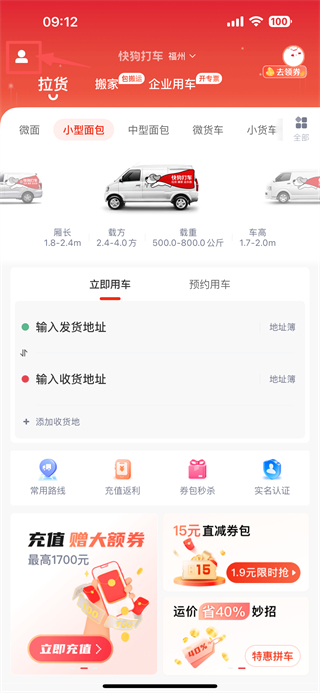 1、打开快狗打车APP,点击左上角个人中心图标,进入个人中心页面。