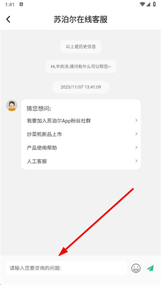 3、进入苏泊尔在线客服页面后,在底部输入框输入要咨询的问题,即可与客服沟通。