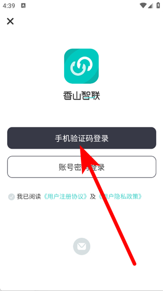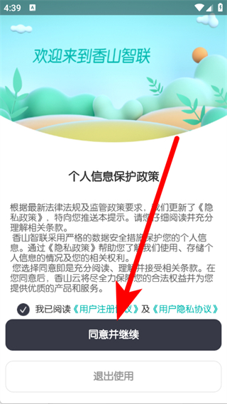 1、打开香山智联,在个人信息保护政策页面勾选协议后,点击同意并继续。