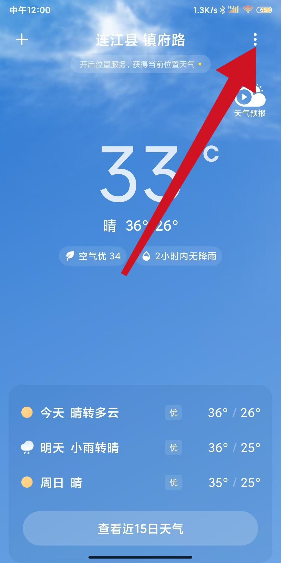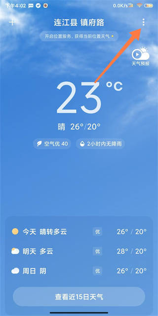 1、打开天气app进入主界面,点击屏幕右上角三点图标。