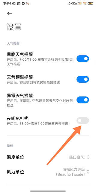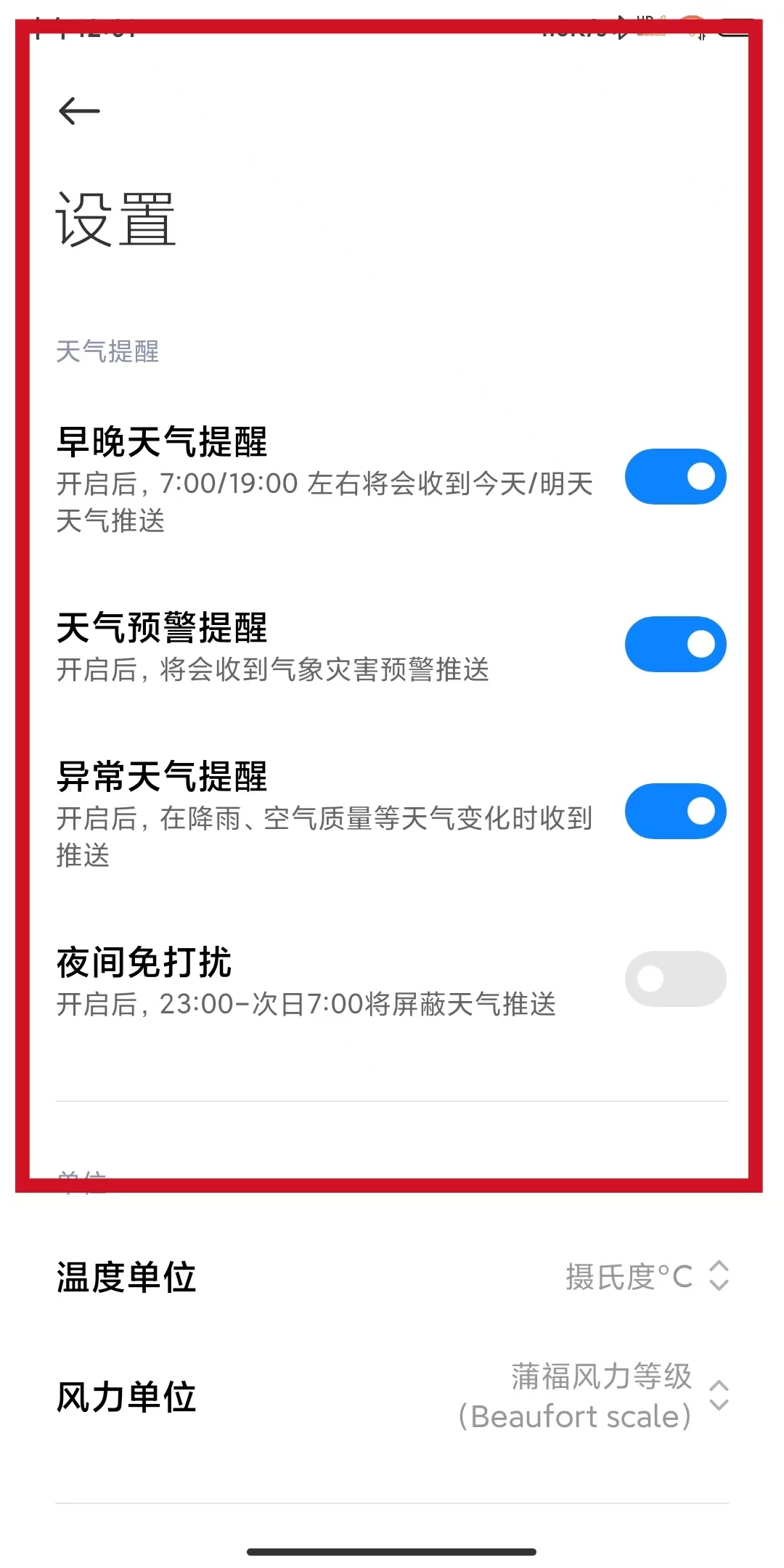 3、在设置页面中找到早晚天气提醒选项,点击其右侧开关按钮。